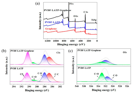As shown in Figure 5a, two prominent peaks representing C 1s and O 1s were observed at 285 and 532 eV on the XPS spectrum, respectively. Compared with the spectra of graphene, there are Ti3p (32 eV) and F1s (688 eV) in PLL and PLLG, indicating that PVDF and LATP are stable after graphene addition. In addition, as shown in Figure 5b,c, after adding graphene, C=O in PLLG decreases, while C-C and C-O increase, which is conducive to the improvement of ionic conductivity.