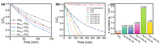 Meng, W.; Zhao, Y.; Dai, D.; Zhang, Q.; Wang, Z.; Liu, Y.; Zheng, Z.; Cheng, H.; Dai, Y.; Huang, B.; et al. Synergy of Au–Pt for Enhancing Ethylene Photodegradation Performance of Flower-like TiO2. Nanomaterials 2022, 12, 3221. https://doi.org/10.3390/nano12183221
