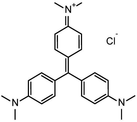Crystal violet (CV) or gentian violet (Figure 1) is a basic dye that typically forms cationic salt upon dissolution in water [5]. It is known that cationic dyes are more toxic than anionic ones, perhaps because of their ability to interact with negatively charged cell membranes [6]. Among the many applications of CV, its usage for coloring things, biological staining, and veterinary and medical purposes is popular. However, it can cause skin and digestive tract irritation and, in extreme cases, it may lead to kidney failure and permanent blindness and, further, may exhibit carcinogenic effects [7,8,9,10,11]. Therefore, the removal of dyestuff from aquatic environments has become of special concern to specialists.