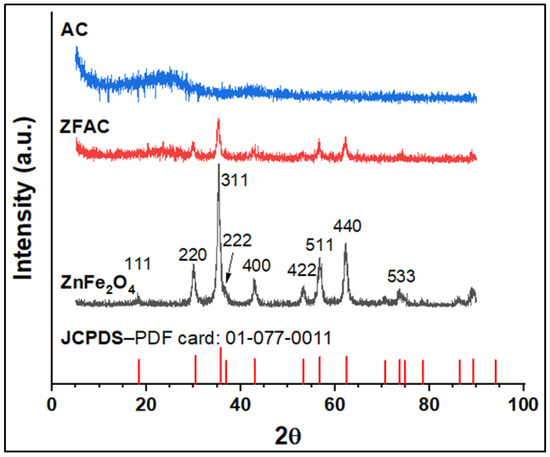 Figure 3 presents the XRD patterns of the studied samples along with the JCPDS card of the metal oxide ZnFe2O4 for comparison. The diffractogram of the obtained spinel metal oxide NPs typically agrees with the literature [36,37] and JCPDS PDF (Card no: 01-077-0011), showing intense peaks at 2θ values of 18.44, 30.44, 35.74, 42.95, 53.28, 56.80, 62.36, and 73.64 corresponding to the planes (111), (220) (311), (422), (400), (511), and (440), respectively. Moreover, no other phases for impurity were found, confirming the structural integrity of the obtained ZnFe2O4 NPs. The resulting cubic ZnFe2O4 has a unit cell parameter of 8.423 Å, which is close to the reported values (8.438 and 8.389 Å) in the literature [38]. It is noteworthy that the broadening peak in the formed spinel structure is an indicative of nano-sized particles. The diffractogram of AC revealed two prominent broad peaks at about 2θ = 19–29° and 40–45° (centered around 2θ = 23.64 and 42.24 and corresponds to the plane 002 and 101), attributed to the amorphous carbon and α-axis of the graphitic structure, respectively [39,40]. The XRD profile of the ZFAC composite was also recorded, and the peaks corresponding to ZnFe2O4 were still identifiable; however, peak intensities were slightly diminished due to AC. All diffraction peaks were indexed to the cubic structure of spinel-doped metal oxide.