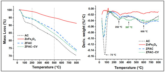 Thermogravimetric (TGA) thermograms (left) and their corresponding derivative (DTG) curves of AC, ZnFe2O4, ZFAC, and ZFAC–CV.