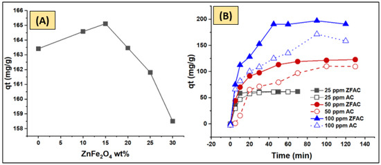 The adsorption performance of various composites was also analyzed. ZFAC composites containing 0, 10, 15, 20, 25, and 30 wt% of ZnFe2O4 were prepared and applied for removal of CV dye from water solutions. As shown in Figure 8A, the adsorption capacity was optimal for the ZFAC containing 15 wt% ZnFe2O4, reflecting the rule, as well as the benefit, of ZnFe2O4 in decorating the AC surface for CV settling [31]. This implies that some chemical/physical and, possibly, mechanical interactions have led to surface modification at low ZnFe2O4 wt% and up to 15 wt%, beyond which the adsorptive properties of ZnFe2O4 dominate as a result of quantity increase. It is worth mentioning that ZnFe2O4 alone has low activity as an adsorbent for CV dye removal as examined during the pilot studies. Moreover, it is reported that ZnFe2O4 with certain structural morphologies and particle sizes may have photocatalytic properties [47,48]. Thus, to ensure that no catalytic CV degradation by ZnFe2O4 occurs, batch experiments of pure AC, pure ZnFe2O4, and ZFAC nanocomposite were separately performed under the adsorption operating condition (30 mg adsorbent, 50 mL of 100 ppm adsorbate, 2 and 24 h agitation time, 150 rpm agitation speed, room temperature, and normal laboratory lighting that automatically shut down overnight). As stated above, there was no change in the CV concentration for the system containing ZnFe2O4 alone, indicating negligible adsorption and further confirming no catalytic effect at the adsorption condition. The time-dependent adsorption of CV onto AC and ZFAC is illustrated in Figure 8B. It is clear that the capacity of ZFAC was higher than that of AC, reaching equilibrium faster. Such results further support the benefit of metal oxide in the modification of the AC surface toward enhancement of its adsorptive properties of cationic dyes including CV.