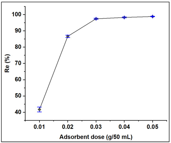 The performance of various ZFAC doses on the removal of CV dye from its aqueous solution was examined for a series of 0.2–1.0 g/L (10–50 mg adsorbent per 50 mL dye solution) keeping other parameters constant (Section 2.4). The results, expressed in terms of adsorption efficiency (Re, %), are illustrated in Figure 10. It can be seen that the Re% increased as adsorbent doses increased from 0.01 to 0.03 g, then, no notable difference in removal efficiency can be seen up to 0.05 g. The general enhancement could be attributed to the increase in the number of available active sites reaching maxima at 0.03 g, beyond which the available sites for adsorption decrease due to overlapping or aggregation [50].