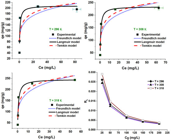 The adsorption equilibrium was evaluated at temperatures of 23, 35, and 45 °C and modeled using the Langmuir, Freundlich, and Temkin isotherms (Equations (4)–(6)). As shown in Figure 11 and Table 2, the adsorption capacity increased with temperature increase, suggesting a temperature-dependent process. According to the values of the coefficient of determination, R2, (e.g., at 296 K), the goodness of fit for the experimental data was found to be in the order of Langmuir (R2 = 0.864), Temkin (R2 = 0.724), and Freundlich (R2 = 0.663); the same trend was kept at 308 and 318 K. The maximum theoretical adsorption capacities (Qm, mg/g) were greater than the experimental ones, increased from 208.29 to 246.19 mg/g as temperature increased from 296 to 318 K, thus demonstrating favored adsorption at higher temperature. The Langmuir dimensionless constant RL was also calculated (Equation (13)), drawn in Figure 11, and tabulated in Table 2 as well. Such a factor is one indication of adsorption favorability: RL = 0 (irreversible), 0 < RL < 1 (favorable), RL = 1 (linear), and RL > 1 (unfavorable). As seen in Table 2, the RL values support favorable adsorption all over the investigated ranges of concentrations and temperatures. Moreover, the tendency of adsorption equilibrium can also be assessed using 1/n; the Freundlich heterogeneity factor with 0.1 < 1/n < 1.0 values support a favored sorption process.