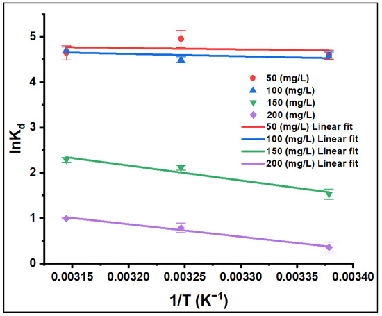 The thermodynamic parameters, including Gibbs free energy change (∆G°), enthalpy change (∆H°), and entropy change (∆S°), were analyzed following expressions given in Equations (7) and (8) [4,27].
