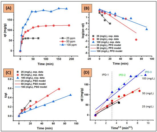 The time-dependent adsorption study was performed at different initial dye concentrations (25, 50, and 100 ppm). The obtained data were fitted to the linear pseudo-first-order (PFO), pseudo-second-order (PSO), and intra-particle diffusion (IPD) models, described by Lagergren–Svenska [28], Ho–McKay [29], and Weber–Morris [30], respectively, as given by Equations (9)–(11).
