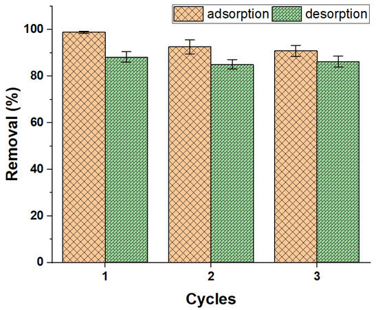 Adsorption efficiency of ZFAC after three cycles of operation. Bars represent the standard error of the mean (n = 2).