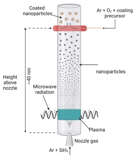 - Dasgupta, M.; Fortugno, P.; Wiggers, H. Plasma-assisted Gas-phase Synthesis and In-line Coating of Silicon Nanoparticles. Plasma Process. Polym. 2020, 17, 1900245. [Google Scholar] [CrossRef]