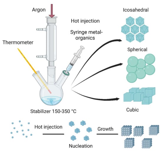 Chemical vapor deposition, sol-gel, solvothermal processes, polymerization, and other chemical precipitation techniques are examples of chemical techniques for the synthesis of NMs []. Laser deposition and electrochemical deposition methods are hybrid systems that combine chemical and physical techniques. Electrochemical methods are an example of physicochemical approaches to producing metal nanoparticles in which a metal anode is dissolved in an aprotic solvent []. Physicochemical methods include hydrothermal and solvothermal processes, CVD templating, microwave irradiation, combustion, thermal degradation, and pulsed laser deposition []. They are usually more complex and hazardous than biological synthesis methods []. Indeed, physicochemical methods are expensive and harmful to the environment due to the need for toxic chemicals. These drawbacks limit their application. Wet chemical synthesis can be used to obtain nanoparticles with specific surface morphologies, phases, shapes, and sizes and thus specific properties. Wet chemical synthesis allows fine-tuning the reaction conditions (e.g., temperature, substrate concentration, additives, pH) to obtain the desired nanomaterials. However, the deposition of toxic reaction byproducts on the nanoparticle surface during their synthesis hinders their application in biomedical fields and is an environmental hazard. For this reason, non-toxic biosynthetic methods have been developed [,].