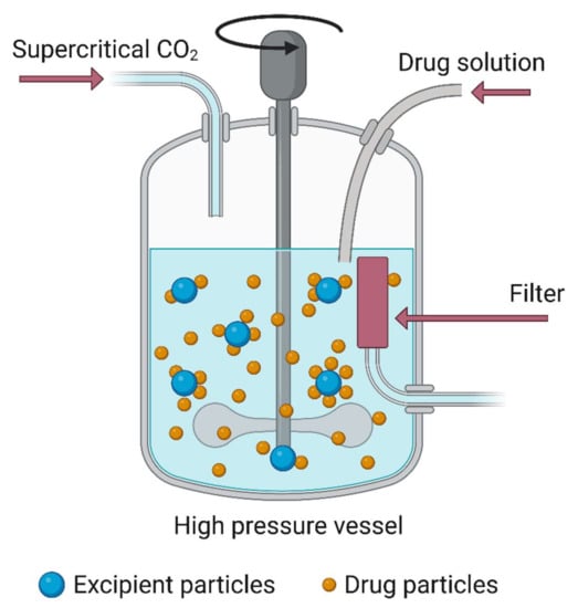 Freeze-drying is a physical process in which the solvent is removed from an NM dispersion in three steps: freezing, sublimation drying, and desorption drying. The freezing step is the most crucial phase. The NM dispersion must be frozen rapidly to prevent the formation of large ice crystals that affect the quality of the final product []. As various stresses occur during freeze-drying, protective agents may be added to the dispersion to protect the NMs. Similar to freeze-drying, drying with supercritical fluids allows producing nanoparticles with uniform particle size/shape and drug distribution without degradation of the nanoparticles or nanostructures [,]. Recently, it has been used to fabricate porous aerogel supports that display good aerodynamic features. Supercritical CO2-based technologies allow the fabrication of NMs with different shapes and sizes (e.g., nanoparticles and nanocrystals) by fine-tuning the operating conditions. Compared with conventional techniques, supercritical synthesis (drying) methods require minimal amounts of harmful solvents that are then eliminated from the final product. Therefore, such methods can be used to produce safe NMs as carriers of active ingredients (nano-drugs). Importantly, polymeric carriers can be added as stabilizers to control drug release and improve the active ingredient processability with the chosen technology [].