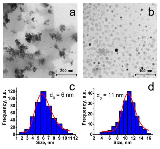The comparative analysis of the IR spectra of the dried Au2Re6-Q colloids, [Au2L2]Cl2, K4[{Re6S8}(OH)6]·8 H2O, and K4[{Re6Se8}(OH)6]·8 H2O indicates the presence of the bands peculiar for the initial [Au2L2]Cl2 complex with broad additional bands of Re6-Q clusters (Figure S3). The dried Au2Re6-Q colloids are manifested in the TEM images (Figure 1a,b) by the aggregates of ultra-small nanoparticles (NPs) with sizes of about 6 and 11 nm, respectively, as is evident from the size distribution histograms (Figure 1c,d), which were made on the basis of the higher-resolution TEM images of the colloids (Figure S4). The aggregation in the dried state is more pronounced for the smaller-sized Au2Re6-S colloids (Figure 1a).