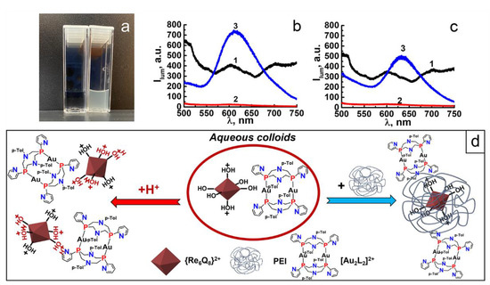 It is worth considering the surface decoration of NPs as the factor influencing their disassembly. The negative ζ–values of Au2Re6-Q colloids (Table 1) derived from their loading with the Re6-Q units can be a reason for their interaction with polycationic polyelectrolytes, such as polyethylenimine (PEI) [48]. However, the mixing of the preliminary separated through centrifugation colloids with the solution of PEI (1g∙L−1) results in the whole disassembly of Au2Re6-Q colloid species, as illustrated in Figure 3a. The spectral analysis of the supernatants after the phase separation reveals high luminescence intensity (Figure 3b,c) derived from the Re6-Q cluster units wrapped by PEI chains, as schematically demonstrated by Figure 3d [47,48].