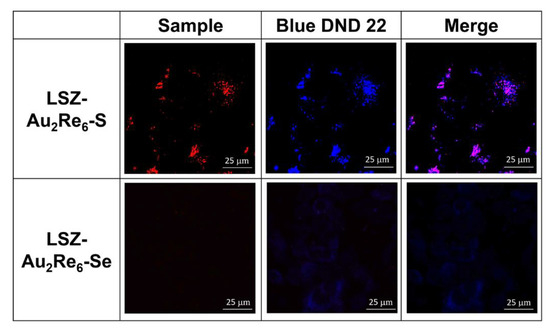 The specificity of the confocal microscopy technique provides a greater opportunity to visualize the endocytic pathway of low-emitting nanomaterial. The cell internalization and intracellular localization of LSZ-Au2Re6-S colloids in the M-HeLa cells have been successfully visualized through the red luminescence of the Re6-S units by means of the confocal microscopy technique, focusing on their lysosomal localization. The latter has been determined through the staining of the cells incubated with the colloids with LysoTracker Blue DND 22, followed by the quantitative evaluation of the colocalization of the red-emitting NPs and blue emitting LysoTracker within lysosomes by the calculation of Pearson’s correlation coefficient (PCC) [15]. The confocal imaging of the cells incubated with the colloids indicates a high contrasting effect of LSZ-Au2Re6-S colloids, but a poor one in the case of LSZ-Au2Re6-Se colloids (Figure 4). In turn, the high contrasting effect of LSZ-Au2Re6-S allows the evaluation of the PCC value, which is 0.79 ± 0.01 (Figure 4). The high (above 0.5) PCC value of LSZ-Au2Re6-S colloids indicates their lysosomal localization [15], while the latter is a prerequisite for disassembly in the acidic environment followed by the release of the highly luminescent Re6-S units. In this connection, it is worth noting that LSZ-Au2Re6-Q colloids exhibit rather low luminescence at neutral pH, while the acidification to pH = 5.0 results in the different luminescence response of the colloids arising from the release of bright-emitting Re6-S and low-emitting Re6-Se cluster units (Figure 2d). This allows for assuming the lysosomal pathway of both NPs as the reason for the different contrasting effects of LSZ-Au2Re6-S and LSZ-Au2Re6-Se colloids.