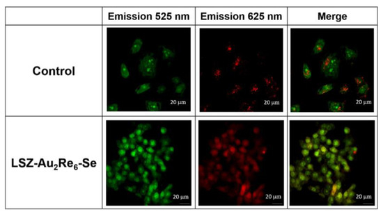 As above-mentioned, the dissolution of the nanomaterial within lysosomes is the prerequisite for lysosome membrane rapture [10,11,12,13,14,15,16,17]. In turn, the cargo-induced rapture of lysosomal compartments can be efficiently monitored through the assay based on Acridine Orange (AO) [22]. The lysosomal localization of AO is followed by the red emission, while its release from the lysosomal compartments into the cytoplasm is visualized by the green emission [22]. The poor contrasting effect of LSZ-Au2Re6-Se allows for following the rapture of endo/lysosomal membranes in M-HeLa cell samples through the AO assay, while the red emission of LSZ-Au2Re6-S interferes with the red emission of AO. Figure 5 demonstrates the red spots in the intact cells derived from the localization of AO in the lysosomal compartments, while more blurred green spots derive from the cytosolic distribution of AO. The AO assay reveals the specificity in the localization of the red and green spots in the cells incubated with LSZ-Au2Re6-Se colloids. The specificity manifested by the blurred red spots interfering with the green ones argues for the enhanced rapture of the cell lysosomes, in turn, derived from the disassembly of LSZ-Au2Re6-Se colloids. Most likely, the lysosomal localization of LSZ-Au2Re6-S is also followed by the rapture of the lysosomal membrane, as observed for LSZ-Au2Re6-Se. Thus, the confocal microscopy results provide both direct evidence of the cell internalization followed by the lysosomal pathway for LSZ-Au2Re6-S (Figure 4) and indirect evidence of the lysosomal pathway for LSZ-Au2Re6-Se colloids (Figure 5). This, along with the aforesaid disassembly of LSZ-Au2Re6-Q colloids in acidified solutions, is the reason for the release of toxic [Au2L2]2+ complex into the cell cytoplasm, which correlates with the high cytotoxicity of the colloids (Table 2).