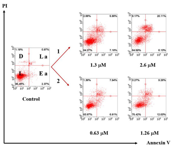 Flow cytometry analysis of M-HeLa cells treated with different concentrations of Au2Re6-S (1) and LSZ-Au2Re6-S (2) after Annexin V and PI staining. The values are presented as the mean ± SD (n = 3): * p < 0.01 vs. the control group. L—living cells; D—dead cells; E. a.—early apoptotic cells; L. a.—late apoptotic cells.