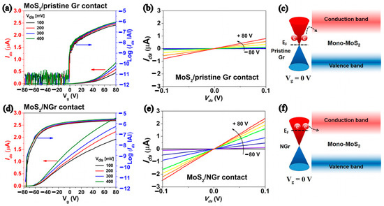 Figure 3. Electrical characteristics of MoS2/pristine Gr contact device: (a) Transfer characteristic (left axis) and semilogarithm (right axis). (b) Output characteristic. (c) Schematic diagram of band alignment. Electrical characteristics of MoS2/NGr contact device: (d) Transfer characteristic (left axis) and semilogarithm (right axis). (e) Output characteristic. (f) Schematic diagram of band alignment. (Reprinted/adapted with permission from Ref. [15]. Copyright 2019 American Institute of Physics).