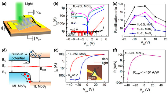 Figure 9. (a) Schematic of the monolayer−multilayer (1L–25L) MoS2 heterojunction device. (b) Ids-Vds characteristics. (c) Rectification ratio as Vgs. (d) Band diagram of the 1 L-ML MoS2 heterojunction in the off state (Vgs = 0; Vds = 0). (e) Ids-Vgs characteristics. The inset is the OM graph of the device. (f) Vgs vs. photoresponsivity. (Reprinted/adapted with permission from Ref. [69]. Copyright 2019 American Chemical Society).