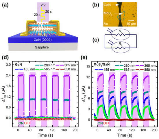 Figure 10. (a) Device structure of MoS2/GaN photodetector. (b) OM graph of the hybrid device. (c) Equivalent circuit diagram of the hybrid device. Photoresponse measurements of (d) GaN devices and (e) MoS2/GaN devices. (Reprinted/adapted with permission from Ref. [24]. Copyright 2021 American Chemical Society).