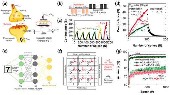Im et al. fabricated multilevel memory based on van der Waals heterostack (HS) N-MoSe2/N-MoS2 FETs and extended it to synaptic memory. Figure 13a shows that the synaptic stacked channel FET was used to simulate a biological synapse. Figure 13b,c illustrates that using a voltage pulse could simulate synaptic behavior. HS memory utilized the capture/de-capture phenomenon induced by VGS for programming/erasing functions. Due to the existence of a heterojunction energy barrier between MoS2 and MoS2, it could maintain a long retention time of 104 s. Based on the P-D characteristics of the device under multiple 60 s short VGS pulses, the simulated recognition rate could reach 94% on average [27], as shown in Figure 13.