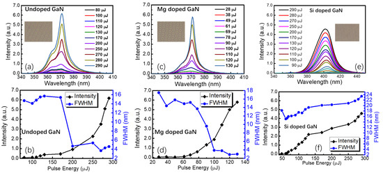 To investigate the lasing properties of the samples, a nanosecond laser at 266 nm was used as the excitation source. When the pulse laser was irradiated on the undoped GaN thin films, the broadband photoluminescence spectra with a full width at half maximum (FWHM) of approximately 16 nm were obtained below the threshold, as seen in Figure 5a. As the laser pulse energy exceeded 170 μJ, an asymmetric photoluminescence spectrum was observed and a sharp peak appeared at the top of the emission peak with a half-peak width of approximately 5 nm or narrower, indicating the formation of resonant radiative lasing emission. As shown in Figure 5b, the intensity of the lasing emission in undoped GaN thin films increased dramatically once the pulse laser energy exceeded the threshold. Compared with the undoped GaN thin films, the lasing emission in the Mg-doped GaN exhibited a lower threshold of 69 μJ and a narrower FWHM of approximately 3 nm (refer to Figure 5c,d). However, no lasing emission and spectrum narrowing phenomenon could be observed in the Si-doped GaN thin films, as drawn in Figure 5e,f; the values of the FWHM became even larger at a higher pulse energy, followed by the slowdown in peak intensity enhancement. The peak center of the photoluminescence showed a blue shift from 406.7 to 401.3 nm and implied the existence of the migration of ions in the active layer with significant thermal losses. As the increasing energy of 266 nm nanosecond pumping laser, no lasing emission but only broadband photoluminescence spectra were observed in the thin films on FSS even at very high pumping laser energy, as seen in Figure S5. It implied that the scattering and resonant of light within the PSS played a crucible role in the lasing emission of GaN and Mg doped GaN thin films.