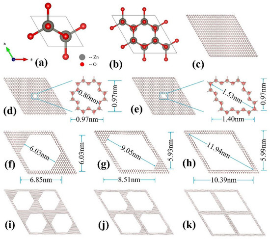 The ground state of a ZnO crystal has a wurtzite (WZ) structure (space group P63mc) with two zinc and two oxygen atoms per unit cell, as shown in Figure 1a. The lattice constants and internal parameters obtained from calculations are as follows: a = b = 3.238 Å, and u = 0.3814, respectively, which is in good agreement with the PRCIM calculation results of Wang et al. [60]. A series of zinc oxide (ZnO) NPF structures were created by making nanopores with different shapes and sizes in periodic WZ-ZnO supercells, as shown in Figure 1. We used different supercell structures (i.e., 8 × 8 × 1-, 12 × 12 × 1-, 16 × 16 × 1-, 20 × 20 × 1-, and 24 × 24 × 1-unit cells) to construct three-dimensional zinc oxide (ZnO) NPF structures. Because symmetry is important for the properties of functional materials [47], we also considered two typical shapes of NPF structures with different symmetries of pores, i.e., diamond-prism-shaped (D-ZnO) and hexagon-prism-shaped (H-ZnO) porous nanomaterials. The different NPF structures constructed remained of the same composition ratios as that of a bulk structure, namely, Zn:O = 1:1. The labels of the NPF structures are denoted as n × n × 1D for D-ZnO and n × n × 1H for H-ZnO, where n is the number of unit cells. The supercells in the z-direction were repeated with 1 unit cell, resulting in a 3D prism shape. The initial NPF-ZnO structures were then relaxed to obtain geometry-optimized stable structures.