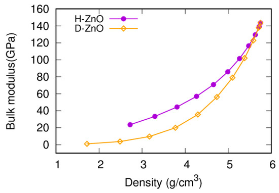 The bulk modulus is an important mechanical property and is a useful indicator of the hardness of a material [62,63,64,65,66]. The bulk modulus of the bulk ZnO obtained in this work is 143.5 GPa, which is in good agreement with previous experimental values (141 GPa [67] and 142.6 GPa [68]), as well as the previous PCRIM (143.5 GPa) [60], ReaxFF (144 GPa) [69], and ab initio calculations (127 GPa [29], 133.7 GPa [70], 149 GPa [71], and 161 GPa [72]). It was interesting to find that the bulk modulus is sensitive to the size and shape of the nanopores. The trends of the bulk moduli for the NPF-ZnO structures with differently sized and shaped nanopores shared several common features (Figure 2). Firstly, the bulk moduli of the NPF-ZnO structures decreased with the increasing size of the pores (decreasing density). Secondly, the decreasing trends of the bulk moduli were quite similar for the NPF-ZnO structures of different shapes, namely, the hexagon-prism shape and diamond-prism shape (n × n × 1H and n × n × 1D supercells). At the same density, the bulk moduli of the D-ZnO structure (n × n × 1D) were much smaller than those of the H-ZnO (n × n × 1H) NPF structures. which means that D-ZnO is softer than H-ZnO.