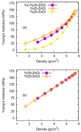 Surprisingly, in the case of the NPF ZnO structure being described by the density of the cells, the mechanical properties are well converged into a unified curve for the different sizes of the unit cells (n × n × 1D or n × n × 1H). The unified pictures, taking the bulk modulus and Young’s modulus as examples, are shown in Figure 7. The bulk modulus of the NPF ZnO structure, obtained from a differently sized supercell, including 8 × 8 × 1H, 12 × 12 × 1H, 16 × 16 × 1H, 20 × 20 × 1H, and 24 × 24 × 1H (with different symbols, as shown in Figure 7a), can be well-fitted in a converged curve (shown by a line). For D−ZnO, ranging from 8 × 8 × 1D to 24 × 24 × 1D supercells, a similar finding can be obtained. For the Young’s moduli of H−ZnO and D−ZnO, the differently sized supercells with different pore sizes can be well-converged into two unified curves (Yz, Yx, or Yy) and three unified curves (if the density is used as a variance, respectively) (Figure 7c,d). Therefore, we have clearly demonstrated that the density of a cell can be a more universal feature for characterizing NPF−ZnO structures in terms of their mechanical properties.