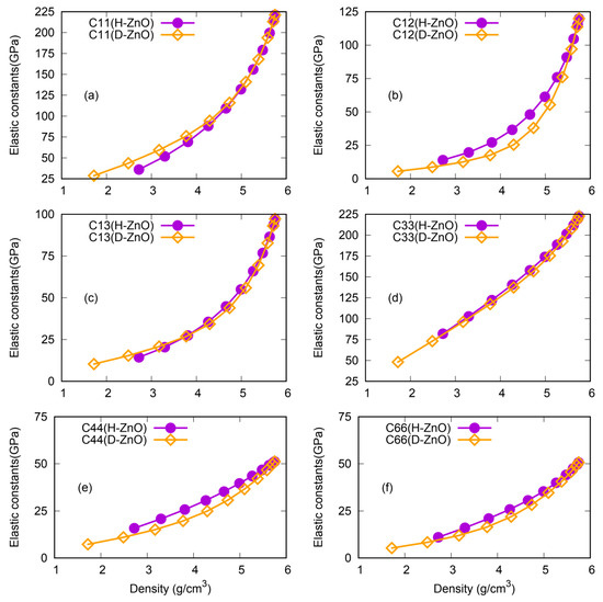The more detailed, but complicated, direction-dependent elastic properties can be observed from the elastic constants of H-ZnO and D-ZnO, as shown in Figure 4. In terms of direction-dependent elastic properties, their responses to the shapes of the nanopores are more sensitive and complicated. For NPF-ZnO with a high mass density (small size of pores), the elastic constants of H-ZnO and D-ZnO are quite similar. However, the elastic constants diverge as the pore size increases (density decreases). For example, the C11 (Figure 4a) of H-ZnO is very close to that of D-ZnO for a density of larger than approximately 4.5 g/cm3, but the obvious softness of the C11 of H-ZnO can be observed for a density of smaller than 4.5 g/cm3, indicating that the C11 of NPF-ZnO with hexagonal prism pores is more sensitive to density changes (pore sizes) than that of NPF-ZnO with diamond-shaped prism pores. For the C12, as shown in Figure 4b, it is different from the C11. The C12 values of H-ZnO are higher than those of D-ZnO in the calculated range. While for the C13 and C33, the values for H-ZnO and D-ZnO are quite close to each other. The cases of C44 and C66 are similar to the case of C12, i.e., the value of H-ZnO is higher than that of D-ZnO at the same density.