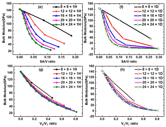 The bulk moduli of the NPF ZnO structures with different characterizations are shown in Figure 6. It is interesting to see that the bulk moduli of the NPF ZnO structures diverge for the different unit cells of n × n × 1D and nn × 1H, being characterized by (i) the layers of atoms removed (Figure 6a,b), (ii) the bonding ratio (CN3/CN4 ratio) (Figure 6c,d), and (iii) the surface-area-to-volume ratio (SA/V ratio) (Figure 6e,f). If the bulk moduli of the NPF ZnO structures are compared in terms of porosity (Figure 6g,h), then the divergence is significantly reduced. The Young’s moduli and elastic constants also follow the same trend.