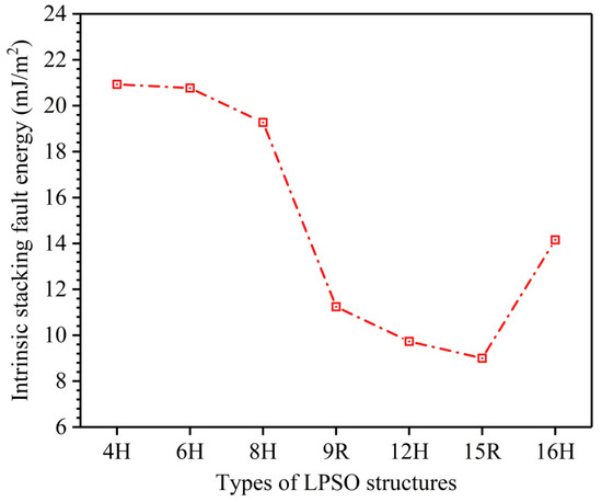 Due to low SFE, many kinds of LPSO structures, such as the 4H, 6H, 8H, 9R, 10H, 12H, 14H, 15R, 16H, 18R, 24R, 29H, 51R, 60H, 72R, 102R, and 192R phases, etc. [20,21,22,23,27], are easy to form and exist stably in Mg metal and its alloys. Herein, I1-constitute LPSO structures including 4H, 6H, 8H, 9R, 12H, 15R, and 16H are investigated, and the calculated results of their ISFEs are shown in Figure 2. The values of these ISFEs are calculated as follows: 20.93 mJ/m2 for 4H, 20.77 mJ/m2 for 6H, 19.27 mJ/m2 for 8H, 11.24 mJ/m2 for 9R, 9.73 mJ/m2 for 12H, 9.00 mJ/m2 for 15R, and 14.16 mJ/m2 for 16H. According to the calculated results of the ISFEs, the order of their numerical sizes is as follows: 4H > 6H > 8H > 16H > 9R > 12H > 15R, indicating that these LPSO structures for 9R, 12H, 15R, and 16H are essentially easy to form and exist stably in Mg metal due to low ISFEs, and the 15R phase is the easiest to form and stabilize among these LPSO structures because of the lowest ISFE, but the others for 4H, 6H, and 8H are comparatively difficult to form and exist stably owing to their relatively high ISFEs, which agrees well with calculation results of formation energy [41] and reveals the reasons for hardly discovering I1-constitute 4H, 6H, and 8H phases in Mg.