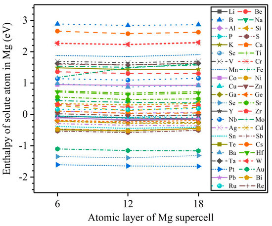 The calculated results of formation enthalpies of solute atoms in a 3 × 3 × L (L = 6, 12, 18) magnesium perfect supercell with one magnesium substituted by a solute.