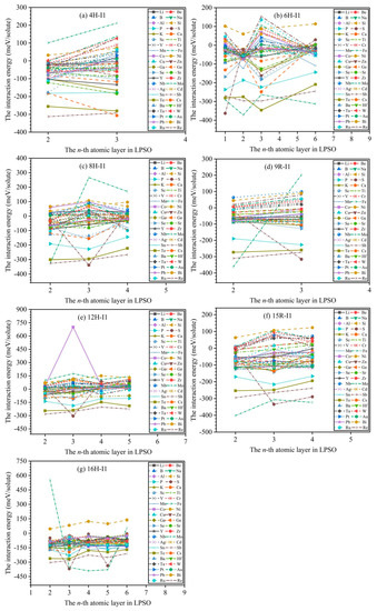 Figure 4 exhibits the calculated results of interaction energies between solute atoms in the n-th layer and m phases. According to the structural symmetry of m phases (see Figure 1), we divide atomic layers with different chemical environmental characteristics as follows: two different atomic layers (second and third layers) for 4H, four different atomic layers (first, second, third, and sixth layers) for 6H, three different atomic layers (second, third, and fourth layers) for 8H, two different atomic layers (second and third layers) for 9R, four different atomic layers (second, third, fourth, and fifth layers) for 12H, three different atomic layers (second, third, and fourth layers) for 15R, and five different atomic layers (second, third, fourth, fifth, and sixth layers) for 16H. Herein, we dope solute atoms in the aforementioned atomic layers with different chemical environmental characteristics, which aims to study the interactions between solute atoms and LPSO structures, and Figure 4 shows the calculated interaction energies.