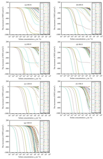 Variation curves of the increments of ISFEs as a function of solute concentrations at : (a–g) denote 4H, 6H, 8H, 9R, 12H, 15R, and 16H phases, respectively.