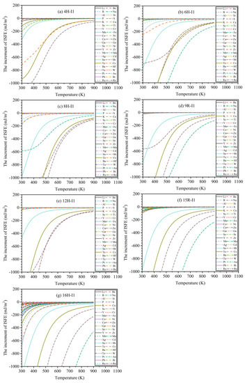 To further explore the influences of finite temperature () on the increment of ISFEs, Figure 6 exhibits the variation curves of the increments of ISFEs as a function of the finite temperature T at for 44 types of solute atoms. With the increase in temperature, the increments of ISFEs increase, indicating that high temperature inhibits the stabilities of m phases, because at high temperatures, smaller numbers of solute atoms are concentrated in the m phases according to the FDD model, and they give smaller contributions in the decrease in the ISFEs. In the 4H phase, the three types of solute atoms (Sb, Te, Cs) significantly decrease the increments of ISFEs with the increase in temperature (), and Sb atom has the strongest effect on decreasing the increments of ISFEs of 4H phase compared with Te and Cs atoms. In 6H, 8H, 9R, 15R, and 16H phases, the four types of solute atoms (S, Fe, Sb, and Te) dramatically reduce the increments of ISFEs with the increase in temperature (), and Fe atom has the strongest effect on decreasing the increments of ISFEs of the 6H, 9R, 15R, and 16H phases with regard to S, Sb, and Te atoms, and the Sb atom has the strongest effect on lowering the increments of ISFEs of the 8H phase compared with S, Fe, and Te atoms. In the 12H phase, the three types of solute atoms (S, Sb, and Te) markedly decrease the increments of ISFEs with the increase in temperature (), where S and Sb atoms have the strongest effects on lowering the increments of ISFEs of 12H phase with respect to the Te atom. Therefore, according to the above results, these potential alloying elements are helpful in promoting the stabilities of LPSO structures at high temperatures, improving mechanical properties of Mg alloys at high temperatures.