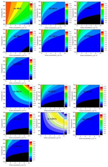 Two-dimensional diagrams of the increments of ISFEs versus solute concentration and temperature in m phases: (a–g) denote 4H, 6H, 8H, 9R, 12H, 15R, and 16H phases for the S atom, (h–n) indicate 4H, 6H, 8H, 9R, 12H, 15R, and 16H phases for the Fe atom, respectively.