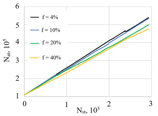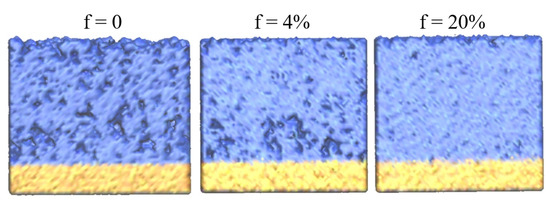 The dependence of the film growth rate on the fraction of the assisting ions is shown in Figure 5. As can be seen from the plots in Figure 5, the number of the deposited atoms increases linearly with number of the injection steps. An increase in the fraction of assisting ions f leads to the decrease of the growth rate. This effect is due to an increase in the number of atoms reflected from the substrate and film with an increase in f. In addition, atoms of the film can be sputtered by high-energy assisting ions, which also reduces the growth rate. This trend was observed earlier in the atomistic simulations of IAD [9]. Thus, an increase in f leads to the films’ densification, but their growth rate somewhat decreases.