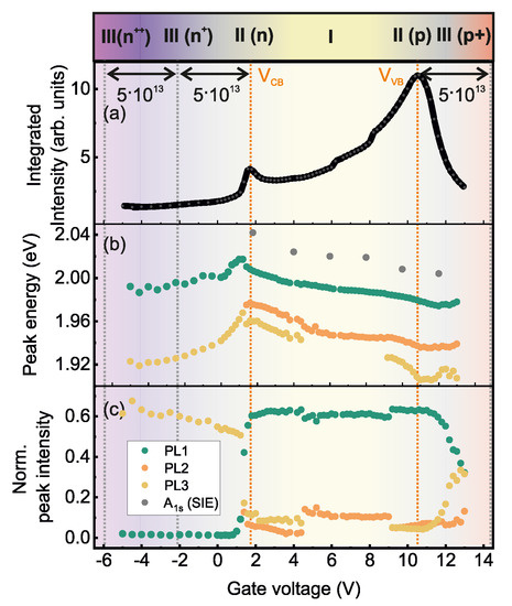 (a) Integrated emission intensities as a function of gate voltages from −5 V 13 V from the spectra displayed in Figure 2a. The maxima indicate voltage values for which is aligned to CB and VB edges. The different doping regimes are highlighted. (b) Peak energies of the line-shape analysis using Gaussian profiles as a function of gate voltages for emission lines PL1, PL2 and PL3. The grey circles are the energies from SIE measurements. Since the measurements were done on two different samples, the effective electric field transferred by the gate voltage is expected to slightly differ. (c) Intensities of the emission lines shown in (b) are normalized to the integrated emission energies shown in (a).