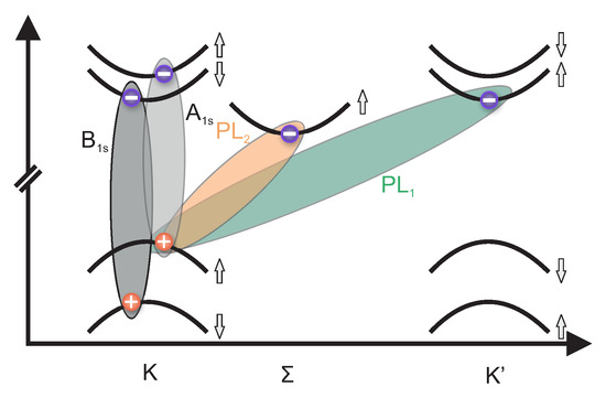 We now turn to the interpretation of the two remaining charge-neutral phonon-assisted emission lines, PL1 and PL2. At the lowest energy direct interband transition at the K, points, the lowest CB and VB states have opposite spins (see sketch in Figure 5). This optical interband transition is therefore spin-forbidden and, hence, dark excitons are generated by optical excitation that can only recombine by emitting or absorbing a suitable phonon connecting K and valleys in order to mediate momentum conservation. The energy difference between the spin-forbidden “dark” state and spin-allowed “bright” transition from the highest VB state to the spin-split CB state at the K, valleys is about 30 meV [48]. This nicely coincides with the energy separation between and PL1. Following this argumentation, PL1 is a phonon-assisted emission from an exciton formed between the spin-split CB and the VB at the points. The remaining peak PL2 is interpreted as phonon-activated transition between the -valley in the CB and the K-valley in the VB. The interpretation that all emission bands observed in room temperature PL experiments are phonon-activated spin/momentum indirect transitions are corroborated by the spectrum of the extinction coefficient (Figure 3c) and low-temperature PL measurements (Figure S3) and in agreement with some experimental and theoretical reports in the literature [17,26,36,53].