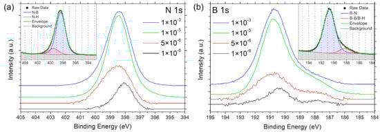 - Trehan, R.; Lifshitz, Y.; Rabalais, J.W. Auger and x-ray electron spectroscopy studies of hBN, cBN, and N+2 ion irradiation of boron and boron nitride. J. Vac. Sci. Technol. A Vac. Surf. Film. 1990, 8, 4026–4032. [Google Scholar] [CrossRef]