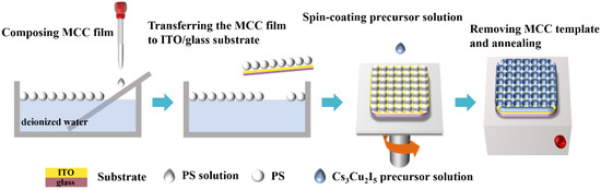 The main manufacturing process of the Cs3Cu2I5 nanonet photodetector is schematically shown in Figure 1. Firstly, in a glass petri dish filled with ionized water, a water/ethanol dispersion containing monodisperse PS colloidal spheres with a size of 1 μm was tightly spread over the water surface to form a MCC film. The film was then transferred the MCC film to the ITO/glass substrate, and annealed at 90 °C for five minutes. The Cs3Cu2I5 precursor solution was spin-coated on the template prepared above, and annealed at 100 °C for 10 min. Finally, after immersing in toluene for 15 min, PS colloidal spheres were removed. After annealing at 100 °C for 1 h, the Cs3Cu2I5 nanonet was formed on the ITO/glass substrate.