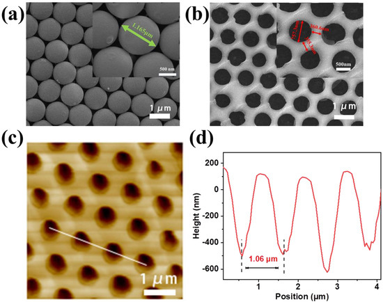 The top-view SEM image and its enlarged illustration in Figure 2a show the close-packed MCC film of 1 μm PS microspheres self-assembled on the surface of ITO, which was used as the template. After spin-coating the Cs3Cu2I5 precursor solution and removing the PS microspheres, the Cs3Cu2I5 nanonet was formed with nanoholes as shown in Figure 2b. As revealed by the SEM images and the inset, the diameters of the Cs3Cu2I5 nanoholes were about 757.3 nm, slightly shorter than the diameter of PS spheres (1165 nm). From AFM in Figure 2c,d, the size of the pores from AFM in Figure 2c was very consistent with the SEM observation in Figure 2b. Moreover, the thickness of the nanonet was about 600 nm, which is smaller than the diameter of the PS microspheres. It suggests the observed Cs3Cu2I5 are actually spherical segments with height higher than that of the halfsphere. As a result, it is comprehensible for the observed diameter of the pore smaller than 1 μm since the maximal pore diameter appears at the half heigh of PS spheres. The AFM result in Figure 2d provides a direct proof for the bowl morphology inside the nanonet since the side wall of the bowl is inclined to the substrate. Figure S1 shows the energy dispersive X-ray spectroscopy (EDS) at the nanonet and at the nanoholes. As expected, there were also signals of Cs, Cu and I in the EDS for the nanohole. This also confirms the observed nanonet is a bowl-like net.