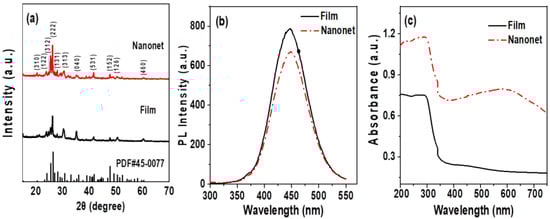 (a) XRD patterns of the Cs3Cu2I5 standard data, Cs3Cu2I5 nanonet and compact films. (b) PL spectra and (c) UV–vis absorption spectra of the Cs3Cu2I5 nanonet and compact film.