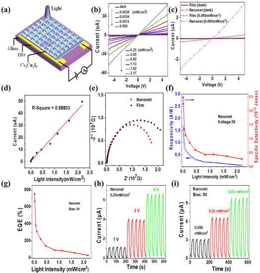 In order to study the potential application of this Cs3Cu2I5 nanonet structure in the field of ultraviolet photoelectric, a lateral structure Cs3Cu2I5 deep ultraviolet photodetector was constructed, with the geometry as seen in Figure 4a. To fabricate such a photodetector, the MCC floating on the water was transferred to a glass substrate which was predefined with ITO interdigital electrodes with a width and pitch of 50 μm; the thickness of the ITO electrode was 150 nm. Then the Cs3Cu2I5 crystalline was directly grown on MCC which was removed by toluene solution. To quantify the performance of the photodetector, I-V characteristics were measured under an incident light of 275 nm with light intensity ranging from 0 to 2.17 mW/cm2. Figure 4b reveals that photocurrent gradually increases with the increase of light intensity and the linear I-V behavior indicates typical ohmic contact between ITO and perovskite. Compared with the traditional planar perovskite photodetector, the photocurrent of the nanonet structure is significantly higher at the same light intensity of 0.095 mW/cm2, as seen in Figure 4c. In addition, the relationship of photocurrent and light intensity can be described by the power law: , where is photocurrent, represents the light intensity and and are the proportional constant and the R-squared coefficient, respectively. Figure 4d shows the fitting curve under 5 V bias and is calculated to be 0.98803, which reflects the conversion efficiency of incident light energy is relatively stable. Furthermore, we measured EIS of the photodetectors with different film structures. As seen in Figure 4e, the diameter of the semicircle corresponding to nanonet is smaller than compact film from the Nyquist plot at the high-frequency region. This indicates that the charge transport resistance of photodetector with the MCC template is relatively small, which can improve carrier transport dynamics. In addition, we calculated other important parameters characterizing the photodetector, including the responsivity (R), specific detectivity (D*) and external quantum efficiency (EQE), to further evaluate its performance. R, D* and EQE are given by the following equations [39]: