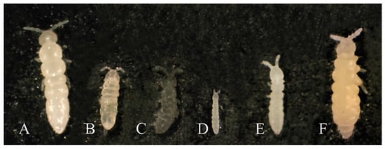 Six collembolan species were used: Folsomia candida, Folsomia fimetaria, Proisotoma minuta, Mesaphorura macrochaeta, Protaphorura fimata and Ceratophysella denticulata (Figure 1, Table 1). The animals were maintained in culture on a moist substrate plaster of Paris and activated charcoal under controlled conditions (19 ± 1 °C, 16:8 (light:dark) photoperiod). The organisms were fed with dried baker’s yeast once a week.