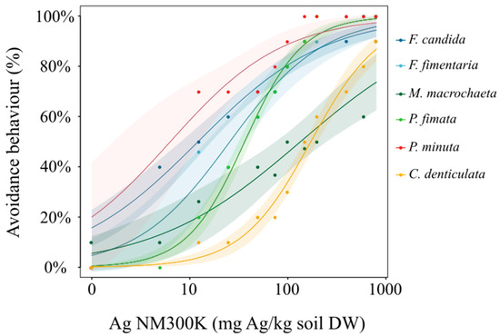 Avoidance behaviour for the different collembolan species when exposed to Ag NM300K (mg Ag NM300K/Kg soil DW) in LUFA 2.2 soil. Solid line represents the fitted model, the light section is the 95% confidence interval.
