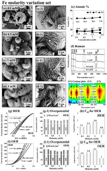 Fe concentration variation between 0.1~3 millimolar (mM) for the fabrication of FeBP MSC electrocatalysts at 100 °C for 12 h. A total of 20 mmol of CH4N2O, 6 mM NaH2PO2.H2O and 6 mM H3BO3 were used. (a–d) SEM images of FeBP electrodes. (a-1–d-1) Magnified SEM micrographs. (e) Atomic% graph. (f) Raman spectra of FeBP. (f-1–f-3) Contour plots of Raman peaks. (g,i) LSV measurements in 1 M KOH. (g-1,i-1) Overpotential bar chart at 50 mA/cm2. (h) and (j) Cdl values for HER and OER.