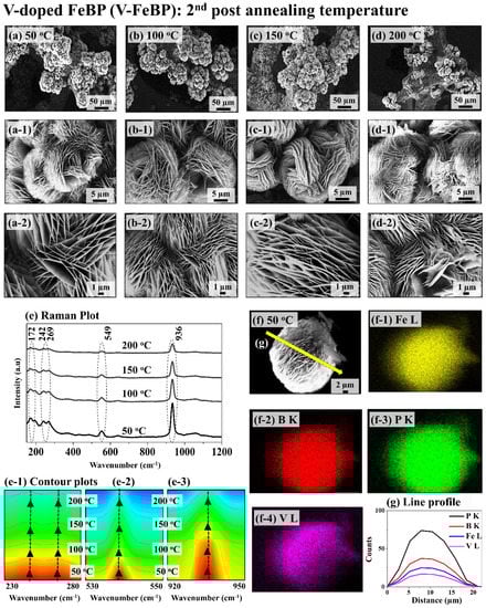 Post-annealing temperature variation (2nd annealing) of vanadium (V)-doped FeBP MSC electrodes between 50~200 °C for 15 min. The best FeBP was fabricated at 100 °C for 12 h with the 1 mM Fe, 3.6 mM H3BO3, 8.4 mM NaH2PO2 and 20 mM CH4N2O. The best FeBP was post-annealed (1st) and doped with V by a soaking approach in 0.2 mM V solution for 15 min at room temperature. (a–d) SEM micrographs. (a-1–d-1,a-2–d-2) Magnified SEM images. (e) Raman plot. (e-1–e-3) Contour plots of Raman peaks. (f–f-4) EDS maps of Fe L, B K, P K and V L. (g) Corresponding EDS line profiles.
