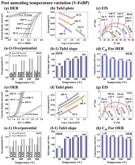 Figure 3 shows the electrochemical characterizations of the V-FeBP MSC electrodes at the post-annealing optimization in terms of LSV, Tafel, EIS and Cdl. As shown in Figure 3a,e, the V-FeBP electrode annealed at 50 °C demonstrated the best HER and OER performances, and the performance gradually became worse with the increased temperature. The 50 °C sample demonstrated the lowest overpotentials of 52 mV and 210 mV at 50 mA/cm2 for the HER and OER, as summarized in Figure 3(a-1,e-1). The bar plots in Figure 3(a-1,e-1) clearly show the overpotential values, which followed the sequence of 50 < 100 < 150 < 200 °C. The improved HER and OER performances could be due to the reduced lattice defects and better electrocatalytic activity following the appropriate heat treatment for an appropriate duration [37]. After the V doping and post-annealing optimization, the surface structure of the electrode can reorganize, and thus can introduce more active sites on the catalytic surface [46]. Additional active sites can speed up the electrochemical HER and OER reaction processes by increasing the conductivity to obtain better HER and OER performances. The V doping of the FeBP can largely improve the conductivity and electron density to enhance the electrocatalytic reaction. The addition of V can tune the electronic structure and activate more active sites. The partial electron transfer is possible from the V2+ to Fe2+ ions, which might help to improve the adsorption capacity of hydrogen protons and hydroxyl groups and improve the HER and OER processes [47]. The HER and OER Tafel analyses are shown in Figure 3b,f. The Tafel slopes can be acquired from the linear range of the HER and OER curves as shown in Figure 3b,f. The Tafel slope values in Figure 3(b-1,f-1) indicate the degree of the reaction and charge-transfer rates. The lower slope values indicate a higher electron transfer and thus a greater reaction rate. The 50 °C sample demonstrated the lowest HER and OER Tafel slope values of 98 and 72 mV/dec, as summarized in Figure 3(b-1,f-1). The HER and OER EIS measurements were performed to understand the transport characteristics of the V-FeBP electrodes. The HER and OER EIS were measured at different overpotential voltages based on the fixed current of 20 mA/cm2 for the consistency between samples. The EIS measurements showed different Rct values at different voltages around the turnover region, as seen in Figure S4 [1]. The higher voltage application showed smaller Rct values and vice versa. In both the HER and OER EIS plots, the charge-transfer resistance (Rct) was gradually decreased with the lower annealing temperatures, and the V-FeBP electrode annealed at 50 °C demonstrated the lowest (Rct) of 25.3 and 26.4 Ω for the HER and OER EIS, which indicates that the 50 °C sample demonstrated the lower conductivity and outstanding charge-transport characteristics [1]. Further, the double-layer capacitance (Cdl) measurements based on the CV plots indicated the highest electrochemical active surface area of the 50 °C sample with 1.84 and 1.95 mF/cm2 in Figure 3d,h. After doping, the electrochemical surface area of the V-FeBP MSC was significantly increased, indicating a higher electrochemical activity of electrode. The CV curves and anodic and cathodic current densities are provided in Figures S40 and S41.