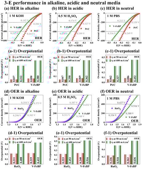 Figure 4 shows the 3-E electrochemical performance comparison of V-FeBP and benchmark electrodes of Pt/C and RuO2 in alkaline, acidic, and neutral waters. Different pH waters were prepared by 1 M KOH (pH 14), 0.5 M H2SO4 (pH 0) and 1 M PBS (pH 7.4). The morphological and elemental analyses of the benchmark electrodes of Pt/C and RuO2 are provided in Figures S42 and S43. Overall, the V-FeBP and benchmark electrodes demonstrated quite stable operations in alkaline, acidic, and neutral waters in Figure 4a–f. At the same time, the benchmark electrodes demonstrated better HER and OER performances in all three solutions, as clearly seen in Figure 4(a-1–f-1). Both V-FeBP and the benchmark electrodes demonstrated similar trends in terms of performance with the overpotentials in alkaline < acidic < neutral waters, indicating that both electrode configurations demonstrated the best performances in 1 M KOH water. The higher performance in KOH can be attributed to the high electrochemical conductivity due to the ionization of OH− [48]. KOH can offer high current density and electrode stability. In the electrochemical reaction process, the cation K+ plays a crucial role in lowering the activation barrier for the dissociation of H2O into OH− + H+ + e−. KOH dissociates into K+ and OH− in water and H2O can be dissociated more easily into OH− and H+ [49]. The lower HER and OER performances in the acidic solution could be due to the slow reaction rate with the electrode degradation in the low-pH water [50]. Similarly, the lowest performances in the neutral media could be due to the low ion migration in PBS solution, which could have resulted in the lowest kinetics during the HER and OER operations [3]. The lack of hydrogen protons or hydroxyl ions can obstruct the mass transport and cause extra energy consumption to dissociate water molecules under neutral conditions [51]. In short, the V-FeBP demonstrated good electrochemical performances with all the optimizations in terms of the LSV, Tafel, EIS, Cdl, TOF and stability. This could be due to the good balance between the V, Fe, B and P components and the good crystalline quality, along with the unique microsphere croissant (MSC) morphology as discussed. Additionally, the HER and OER steady-state current observations were performed by the comparison of the LSV and CA currents in a 3-E system in Figures S44 and S45. This was to show the stability of the electrodes at different current densities [52]. The V-FeBP annealed at 50 °C demonstrated stable operations at various voltages as summarized in Figures S44 and S45, indicating a good stability of the V-FeBP electrode. One thing to notice here is that the V-FeBP achieved a comparable OER result in 1 M KOH in Figure 5d, indicating that the 2-E operation of V-FeBP electrodes can largely benefit from the good OER performance.