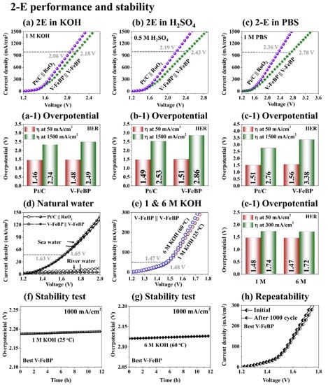 Figure 5 shows the 2-E electrochemical performance of V-FeBP and benchmark electrodes in alkaline, acidic, and neutral media and the stability test. In the 2-E configuration, the Pt/C ‖ RuO2 were used as the cathode and anode, and two V-FeBP electrodes were adapted as bi-functional electrodes, i.e., V-FeBP ‖ V-FeBP. Generally, the 2-E water-splitting performance trend was similar to the 3-E, i.e., alkaline < acidic < neutral waters, in Figure 5a–c. The specific overpotentials at 50 and 1500 mA/cm2 are summarized in Figure 5(a-1–c-1). The overpotentials were 1.46 and 1.48 V at 50 mA/cm2 and then reached 2.34 and 2.49 V at 1500 mA/cm2 in 1 M KOH for the Pt/C ‖ RuO2 and V-FeBP ‖ V-FeBP in Figure 5(a-1). The overpotentials were 1.49 and 1.51 V at 50 mA/cm2 and 2.53 and 2.86 V at 1500 mA/cm2 in 0.5 M H2SO4 in Figure 5(b-1). Similarly, the overpotentials were 1.51 and 1.56 V at 50 mA/cm2 and 2.76 and 3.68 V at 1500 mA/cm2 in 1 M PBS in Figure 5(c-1). The benchmark configuration demonstrated better water-splitting performances over the V-FeBP ‖ V-FeBP configuration due to the superior intrinsic electrochemical properties of Pt/C and RuO2 for the HER and OER operations. Notably, the bi-functional configuration of V-FeBP demonstrated 2.18 V as compared with 2.06 V of the Pt/C ‖ RuO2 at 1000 mA/cm2 as identified in Figure 5a, which is a quite comparable performance to the benchmarks. This indicates that V-FeBP ‖ V-FeBP can demonstrate a compatible water-splitting performance as compared with the Pt/C ‖ RuO2 in 1 M KOH water, with the costs of the electrode materials being several orders less.